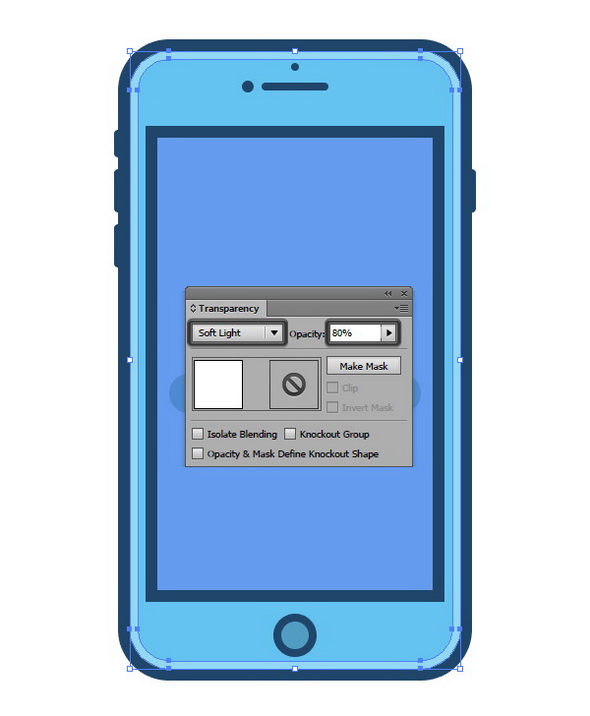 Теперь выделим дубликат и офсет и применим Pathfinder > Minus Front / Обработка контуров > Минус верхний, что удалит ненужные элементы. Мы сделаем из него круговой световой блик, задав цвет #FFFFFF, установив Blending Mode / Режим Наложения на Soft Light / Рассеянный свет, а значение Opacity / Непрозрачность на 80%.