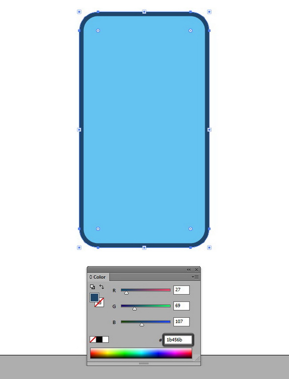 При помощи инструмента Rectangle Tool / Прямоугольник создадим фигуру с размерами 230 на 140 px и цветом #659def, которая будет дисплеем нашего смартфона. Задайте этой фигуре толстую обводку толщиной 6 px и залейте, например, цветом #1b456b.