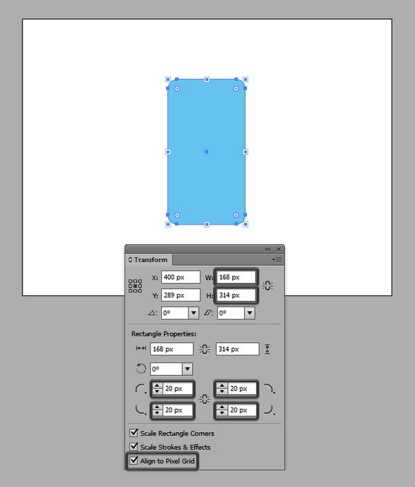 Перемещаемся на первый слой. Используя инструмент Rounded Rectangle Tool / Прямоугольник со скругленными углами, создадим фигуру размером 168 x 314 пикс с радиусом углом 20 px, зальем голубым цветом #64c4f1 и затем разместим в центре нашей рабочей области.