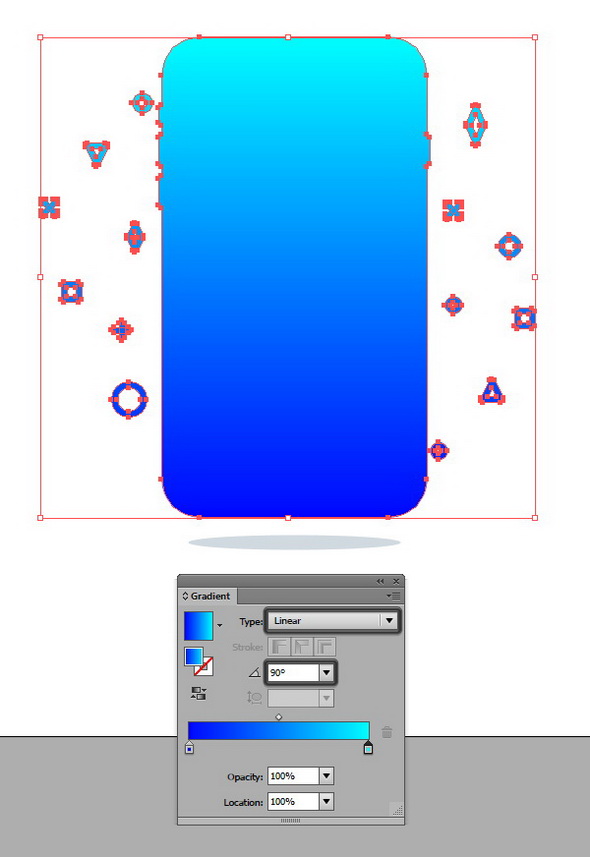 Выделите все, что мы только что создали, и примените линейный градиент, используя цвет #0000ff слева и цвет #00ffff справа. Убедитесь, что наклон установлен на 90°.