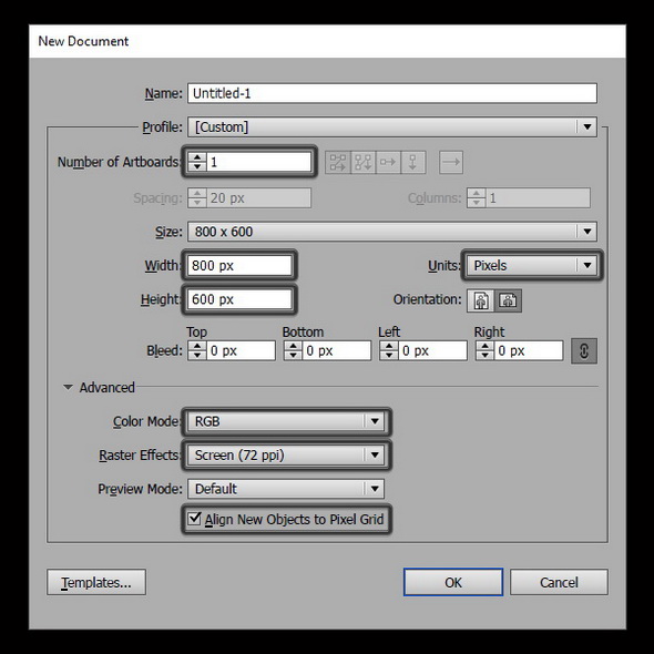 Создаем новый документ при помощи меню File > New / Файл > Новый или используйте сочетание горячих клавиш Control-N. Задайте размер 800 x 600 px и следующие параметры: