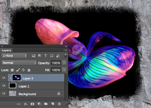 Но у нас все еще видна текстура камня на фото. Чтобы скрыть его, нам понадобится белый слой. Активируйте фоновый слой (слой с текстурой), кликните по иконке Create a new layer/Создать новый слой, нажмите на клавишу D, а затем на Command-Delete (PC: Control-Backspace), чтобы залить фон белым цветом.