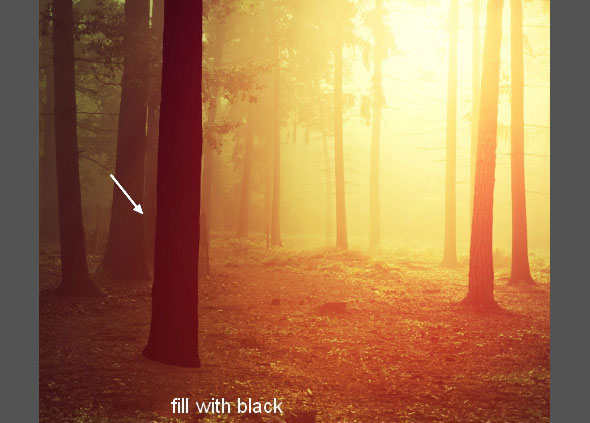 Создайте новый слой под слоем с корректирующими слоями. Инструментом Polygonal Lasso/Многоугольное лассо (L) выделите ствол дерева на переднем плане. В меню выберите Edit > Fill/Редактировать>Залить и залейте выделение черным цветом: