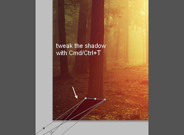Конвертируйте этот слой в смарт-объект (Convert to Smart Object). В меню выберите Edit >Transform > Flip Vertical/Редактировать>Трансформировать>Отразить по вертикали и используйте свободное трансформирование (Cmd/Ctrl+T), чтобы исказить тень как показано ниже: