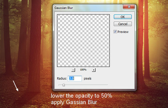 Снизьте непрозрачность этого слоя до 50% и немного размойте его: Filter > Blur > Gassian Blur/Фильтр>Размытие>Размытие по Гауссу: