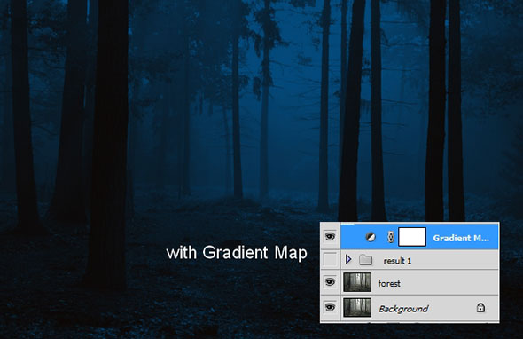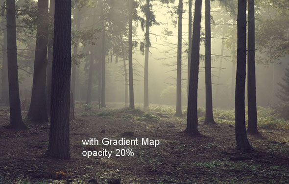 Теперь давайте изменим цвет леса при помощи корректирующего слоя. Найдите в меню Layer > New Adjustment Layer > Gradient Map/Слой>Новый корректирующий слой>Карта градиента: