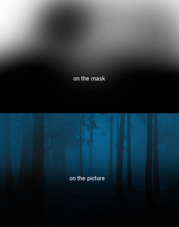 В маске корректирующего слоя Curves/Кривые рисуйте растушеванной кистью черного цвета в верхней центральной части, чтобы избавить эту область от эффекта.