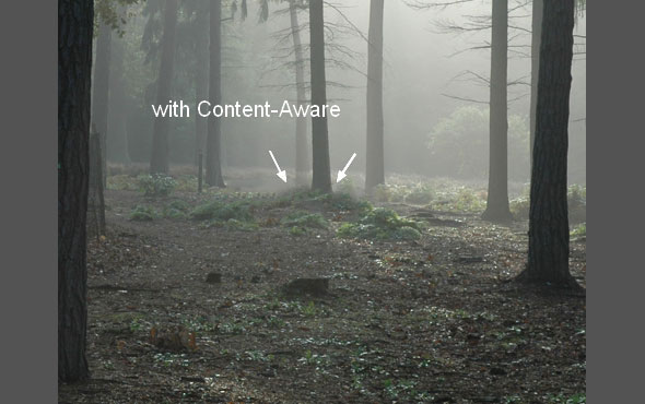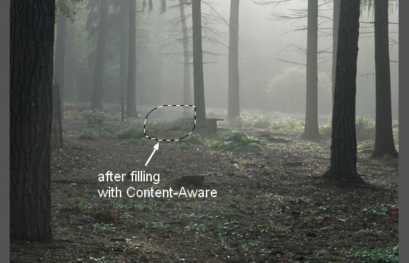 Инструментом Lasso/Лассо выделите часть со скамейкой и в меню выберите Edit > Fill > Content-Aware/Редактировать>Залить>С учетом содержимого. Вот что должно получиться: