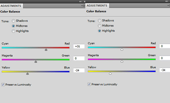 Используем корректирующий слой Color Balance/Баланс цвета, чтобы добавить красных и желтых цветов: