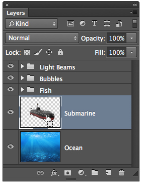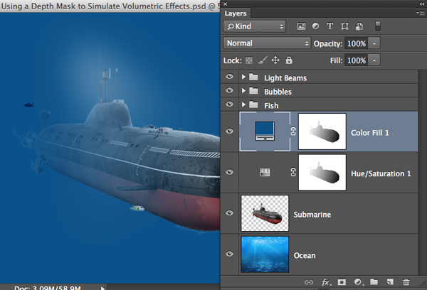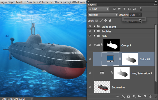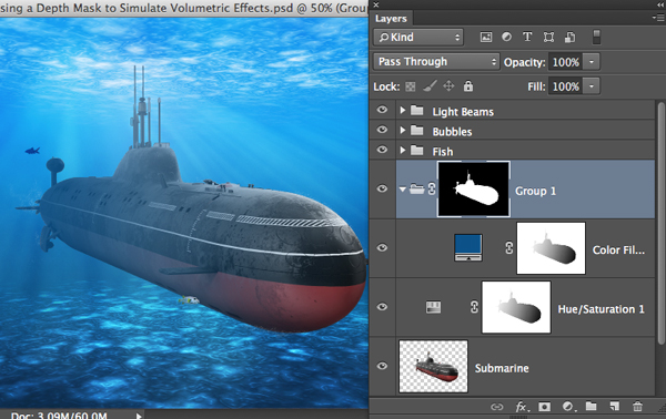 Чтобы избавиться от действия этой коррекции на всю работу и оставить ее только на подлодке, нажмите Command-G (PC: Control-G) — так вы добавите слой-заливку к группе. Удерживая Command/Control, кликните по оригинальному слою с лодкой, чтобы загрузить выделение по ее контуру. Кликните по иконке Add layer mask/Добавить слой-маску в нижней части палитры Layers/Слои, чтобы указать маску группе и скрыть эффект в нежеланных частях. Обратите внимание как подлодка выплывает теперь из пучины.