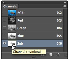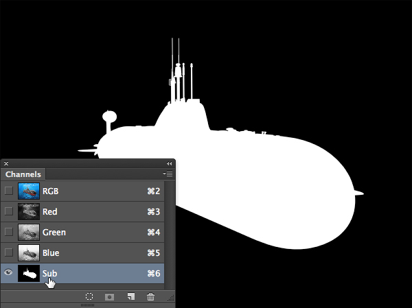 Теперь мы приберем красный цвет по мере удаления подлодки. В палитре Channels/Каналы кликните по каналу «Sub», удерживая Command/Control, чтобы загрузить соответствующее выделение.