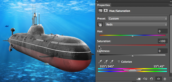 Теперь давайте погрузим субмарину в воду. Сделайте активным слой Hue/Saturation / Цветовой тон/Насыщенность (не маску этого слоя). Возьмите инструмент Eyedropper/Пипетка и кликните по темному синему цвету в изображении.