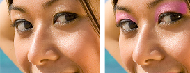 Чтобы сменить цвет уже нарисованного макияжа, выберите слой, с которым хотите произвести это действие, создайте выделение контуру содержимого слоя (удерживая Command/Ctrl, кликните по слою). Вы увидите как появится область вокруг элемента в слое. Затем кликните по черно-белому кружочку в нижней части палитры Layers/Слои и выберите Hue/Saturation / Цветовой тон/Насыщенность. Photoshop создаст корректирующий слой, который будет действителен только для области выделения. Кликните по иконке левее нового слоя, чтобы настроить параметры коррекции. Двигайте бегунки, чтобы менять оттенок, насыщенность и яркость макияжа.