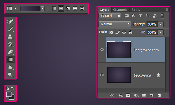 Создайте новый документ размером 1250 x 825 px. Выставите первым цветом #473f56, а фоновым — #241c31. Возьмите инструмент Gradient/Градиент, выберите радиальный градиент от первого цвета к фоновому в панели настроек. Растяните градиент от центра к углу. Дублируйте фоновый слой.