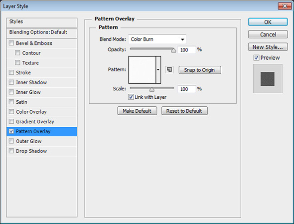 Кликните дважды по копии фонового слоя и примените стиль слоя Pattern Overlay/Перекрытие узора. Настройте параметры как показано ниже и выберите паттерн из исходников.