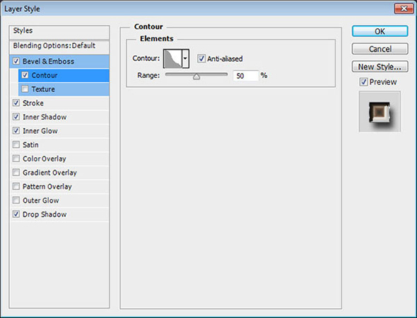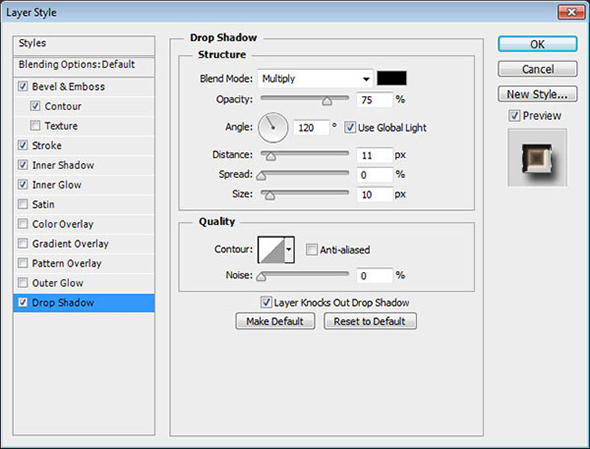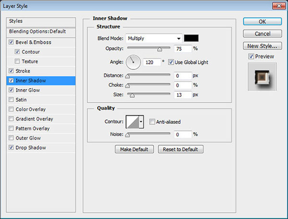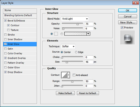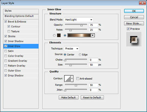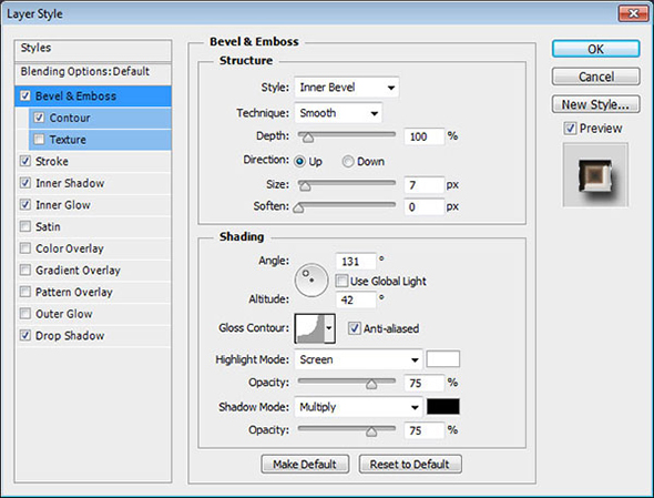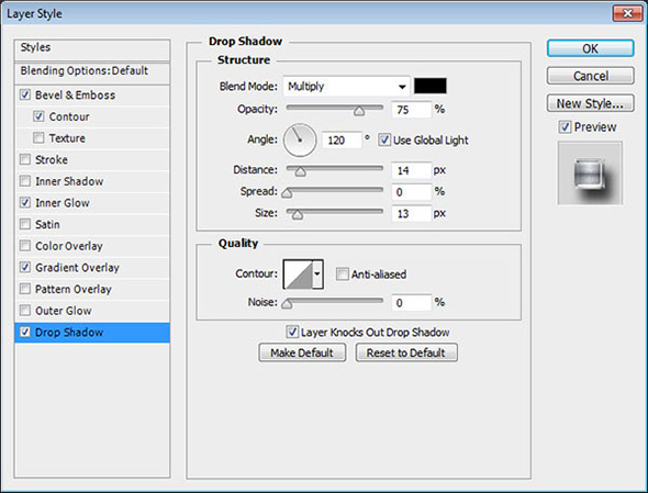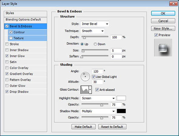 Кликните дважды по иконке слоя, чтобы применить к нему следующие стили слоя: