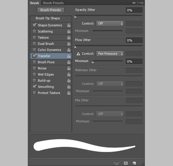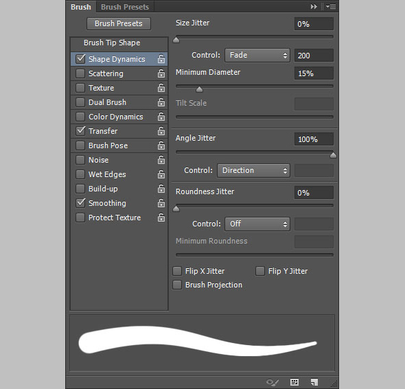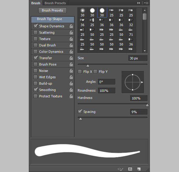 Откройте палитру Brush/Кисть и выберите круглую кисть размером 30px. Настройте ее как показано ниже: