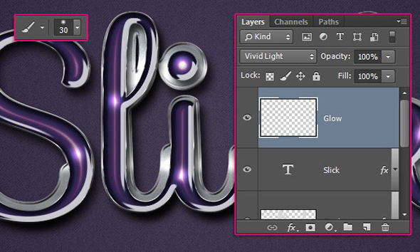 Создайте новый слой поверх всех остальных слоев и назовите его “Glow”. Укажите этому слою Blend Mode/Режим наложения Vivid Light/Яркий свет. Затем выберите в качестве первого цвета #d7d7d7, возьмите мягкую круглую кисть размером в 30 px и рисуйте небольшие вспышки на светлых частях текста.