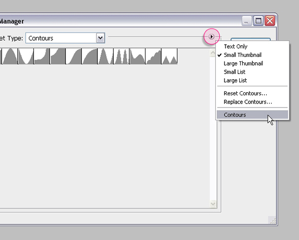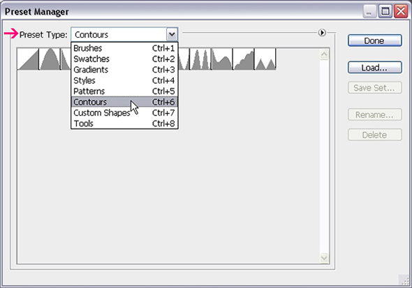 Нам понадобятся некоторые контуры для стилей слоя. Чтобы загрузить необходимые контуры, в меню найдите Edit -> Preset Manager/Редактировать>Управление наборами, и выберите Contours/Контуры в выпадающем меню.