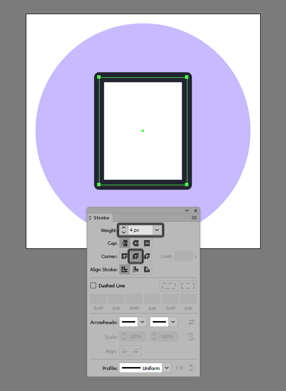 Укажите прямоугольнику Stroke/Обводку цвета #1C202D и толщиной в 4 px. Также укажите обводке скругленные углы.