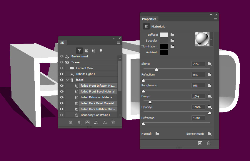 Откройте палитры 3D и Properties (обе найдете в меню Window). Нам понадобится изменять параметры в обеих палитрах.