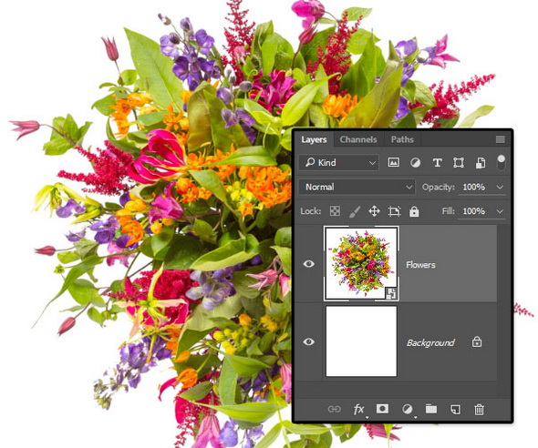 1. Создайте новый документ с размером 3000 на 3000 пикс. Поместите изображение Bouquet of flowers поверх фонового слоя и переименуйте слой в Flowers.