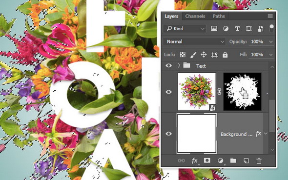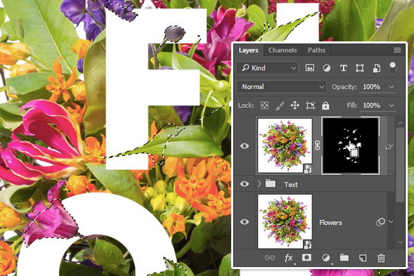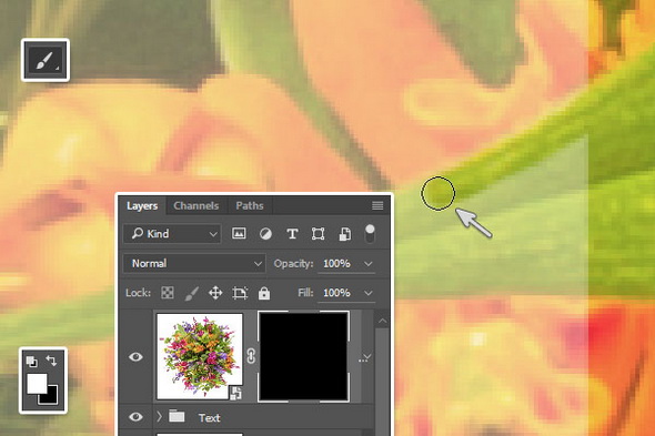 Кликните по иконке маски копии слоя Flowers, чтобы выделить ее и начинайте рисовать поверх тех элементов, которые вы хотите поместить на передний план (то есть они будут перед текстом).
