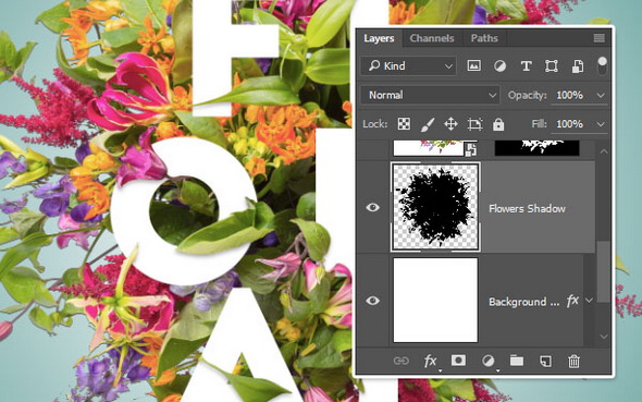 4. Используйте инструмент Move Tool / Перемещение, чтобы опустить тени слегка вниз.Вы заметите, как тень внезапно появляется в некоторых стертых областях. Чтобы это исправить, вам необходимо вернуть эти части, сделать их нарисованными. Поэтому возьмите инструмент Brush Tool / Кисть, выделите маску копии слоя Flowers, задайте белый цвет для переднего плана и нарисуйте поверх частей, которые нужны для тени.