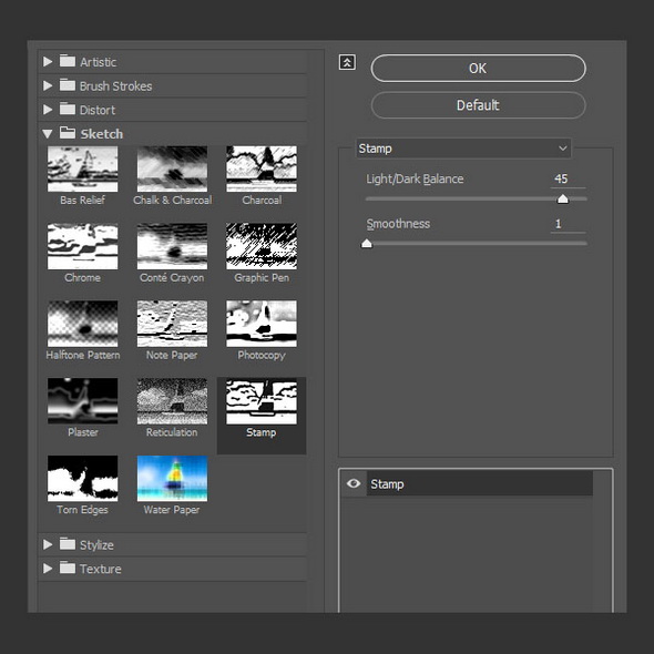 Выберите фильтр Stamp / Штамп и поменяйте баланс светлого/темного на 45, а мягкость на 1.