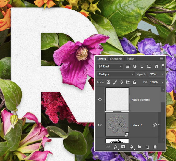 1. Поместите скачанную текстуру Paper Grain Texture поверх всех слоев и измените размер, как вам видится. Потом поменяйте режим наложения этого слоя на Multiply / Умножение с непрозрачностью 50%.