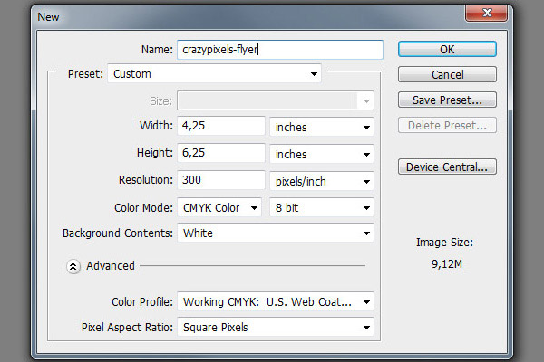 Открываем Photoshop и создаем новый документ. Размер 4,25 х 6,25 inches. Resolution: 300 DPI, Color: CMYK