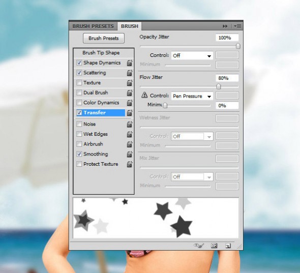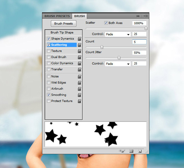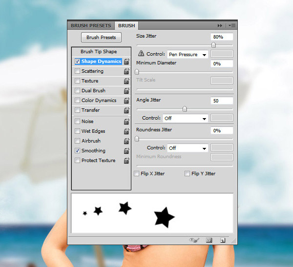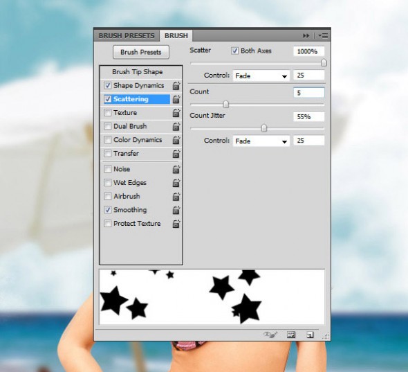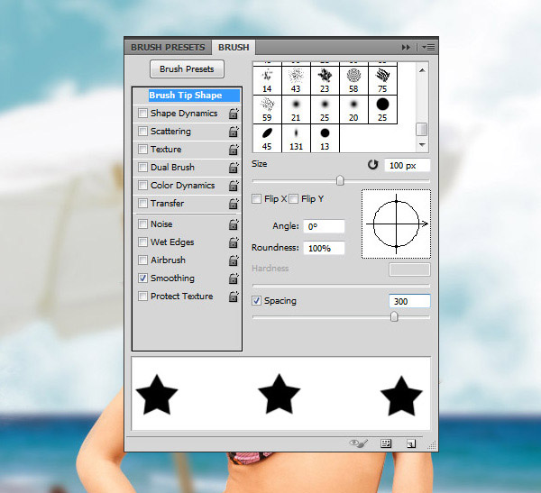 Перейдем снова на наш документ с флаером. Создадим новый слой, разместим его за девушкой, но перед фото с пляжем. Выберем Brush Tool и откроем окно с настройками (F5)