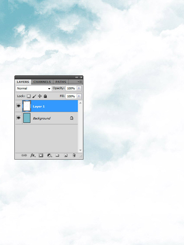 Используя Brush Tool заливаем фон #78bbc8 цветом. Создаем новый слой и размещаем его над фоном. Снова берем инструмент BrushTool, выбираем кисти облаков скаченные ранее и делаем нечто подобное: