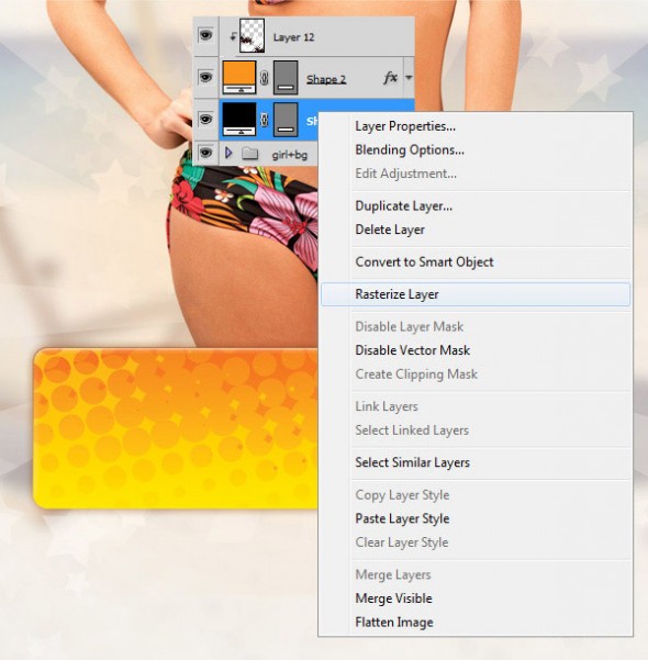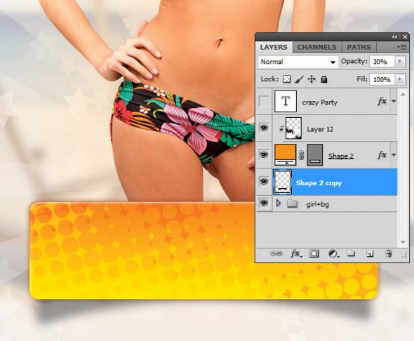 Наляписто разместите все элемента на флаере. Объедените их в группу и перенесите под слой с девушкой.