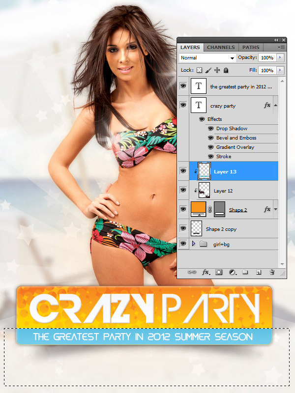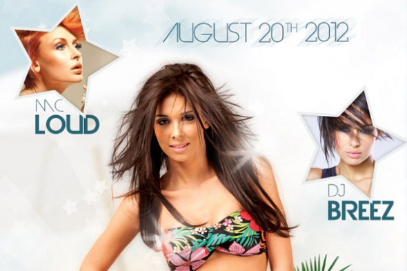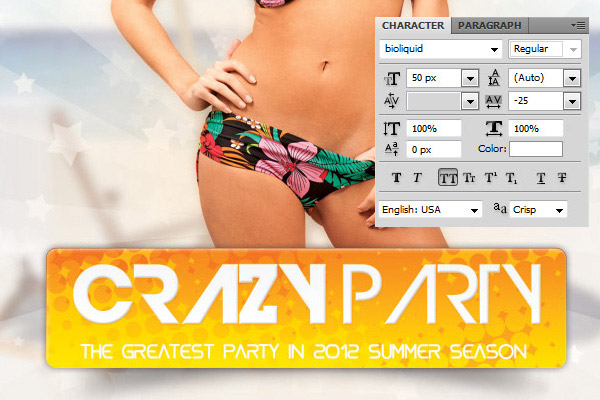 При необходимости можно добавить какой то слоган или дополнительный текст. Я, например, хочу добавить “the greatest party in 2012 summer season”. Для этого я использую шрифт Bioliquid размером 50 пикслей и белым цветом.