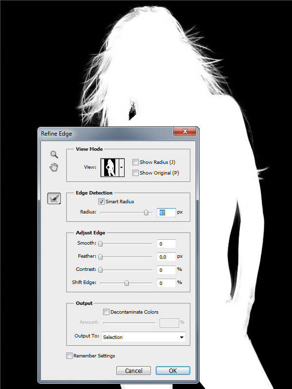 Нажимаем на Refine Edge. View: Black & White, ставим галочку напротив Smart Radius, а сам радиус выставляем 95-100
