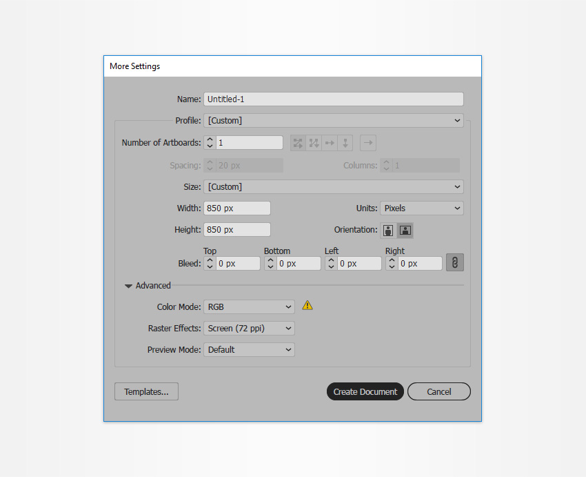 Нажмите Control-N, чтобы создать новый документ. Настройте параметры как показано ниже.
