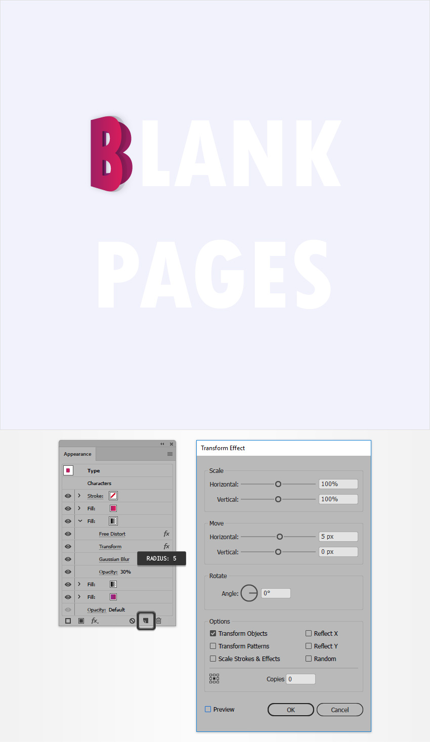 Выделите среднюю заливку и нажмите на иконку Duplicate Selected Item/Дублировать выделенный объект. Выделите новую заливку и снизьте Opacity/Непрозрачность до 30%, затем выберите Effect > Distort & Transform > Transform/Эффект>Искажение и трансформация>Трансформировать. Настройте параметры трансформирования как показано ниже и нажмите OK. Теперь выберите Effect > Blur > Gaussian Blur/Эффект>Размытие>Размытие по Гауссу. Укажите радиус размытия в 5 px и нажмите OK.