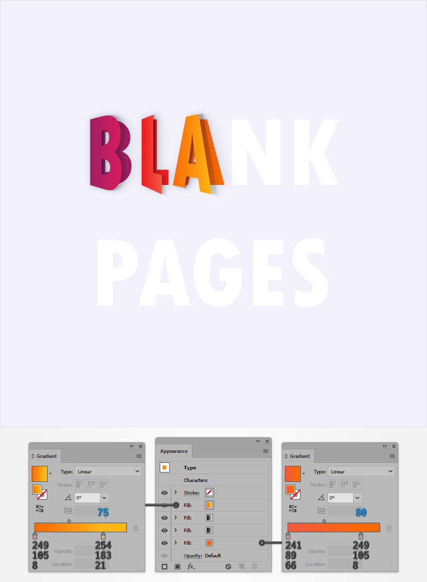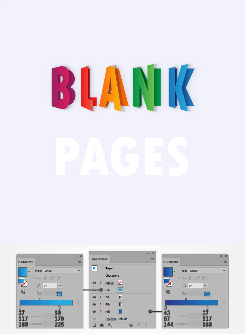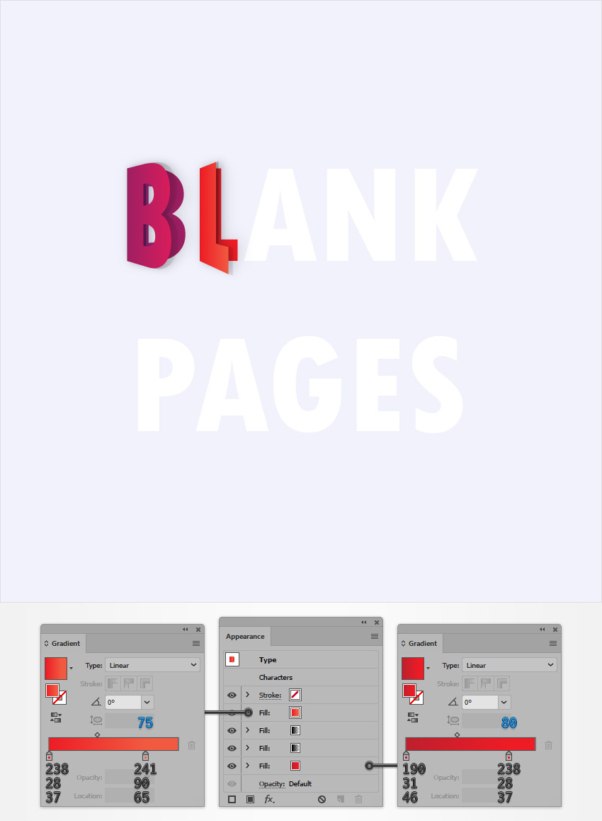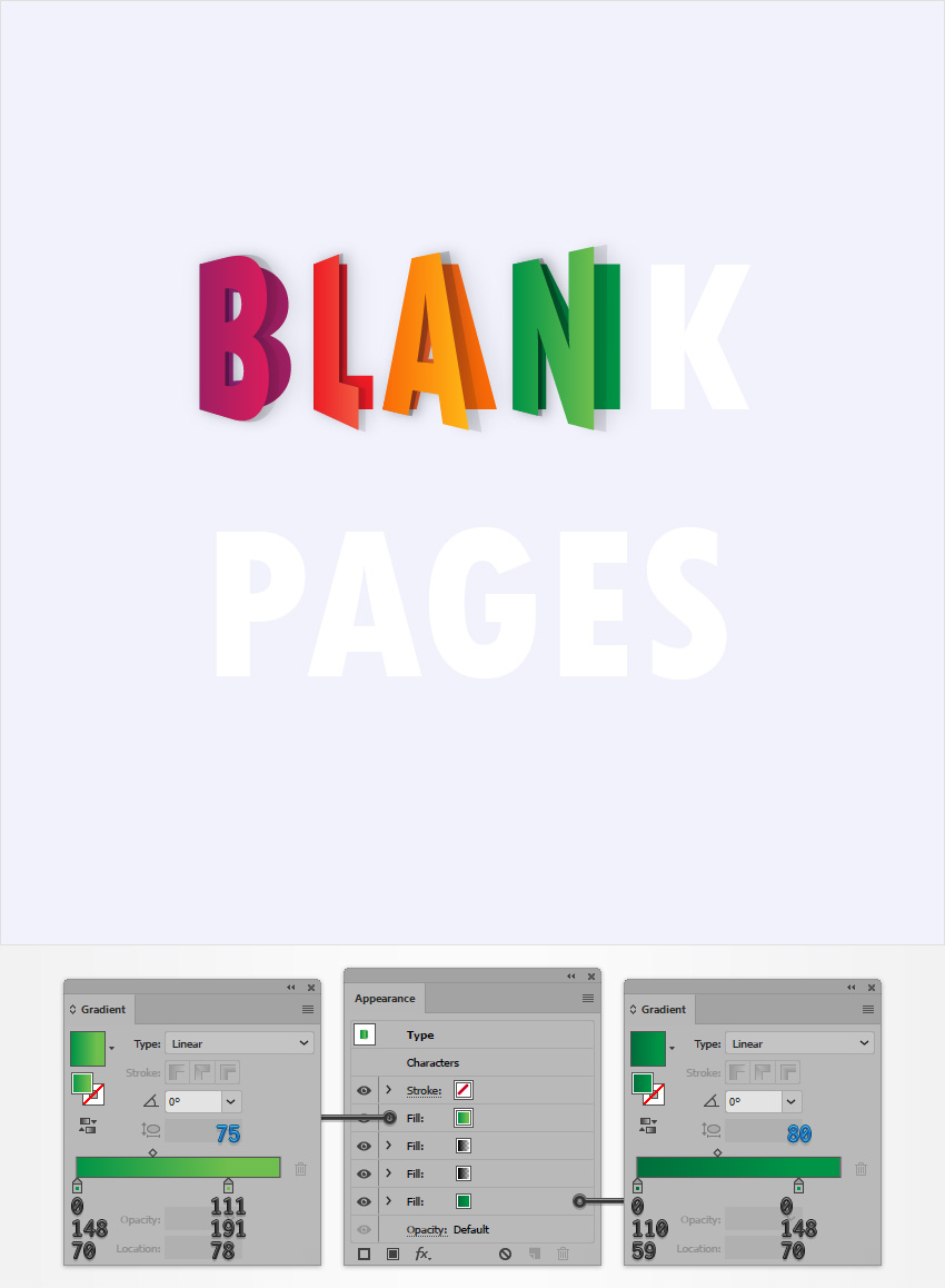 Теперь выделите эту вторую букву и вернитесь в палитру Appearance/Оформление. В ней просто замените два цветных градиента на новые, как показано ниже.