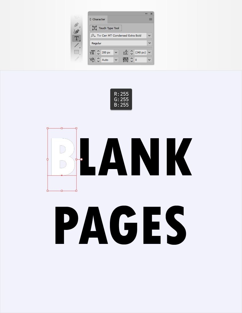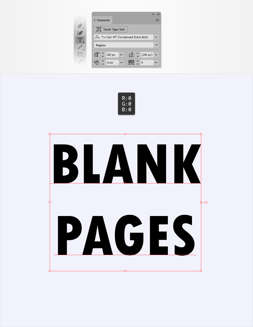 Возьмите инструмент Type/Текст (T) и откройте палитру Character/Символ (Window > Type > Character/Окно>Текст>Символ). Выберите шрифт Tw Cen MT Condensed Extra Bold (или любой жирный шрифт, который нравится вам), размер 200 px и Leading/Интерлиньяж в 240 px.