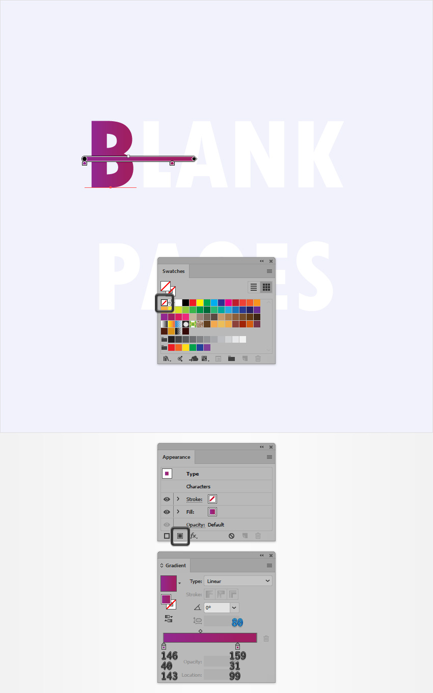 Выделите одну из букв и откройте палитру Swatches/Образцы. Кликните по пустому цвету, чтобы снять заливку с буквы. Перейдите в палитру Appearance/Оформление и добавьте новую заливку, нажав соответствующую кнопку в нижней части палитры.
