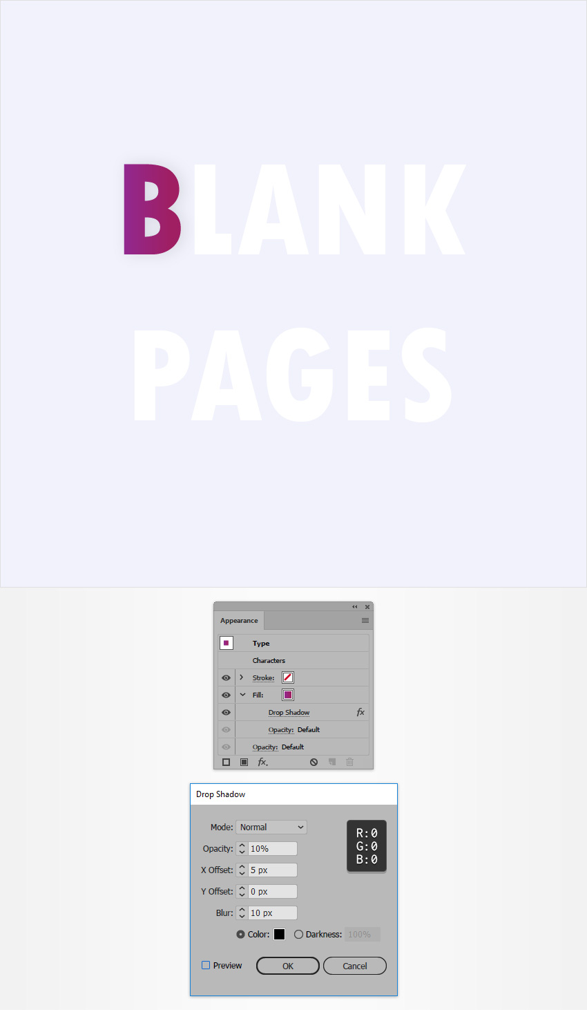 Не снимайте выделения с буквы и вернитесь в палитру Appearance/Оформление. В палитре выберите Effect > Stylize > Drop Shadow/Эффект>Стилизация>Тень. Укажите параметры как показано ниже, и нажмите OK.