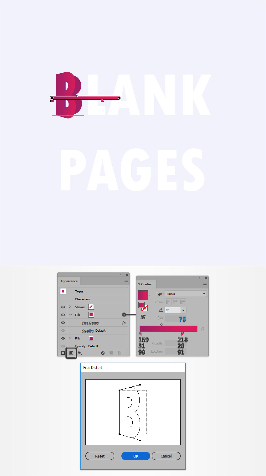 По прежнему не снимайте выделения с буквы, и в палитре Appearance/Оформление добавьте еще одну заливку, нажав на кнопку Add New Fill/Добавить заливку. Выделите эту новую заливку и укажите ей линейный градиент как показано ниже. Теперь выберите Effect > Distort & Transform > Free Distort/Эффект>Искажение и трансформация>Свободное трансформирование. Перетащите две правые точки как показано ниже, и нажмите OK.