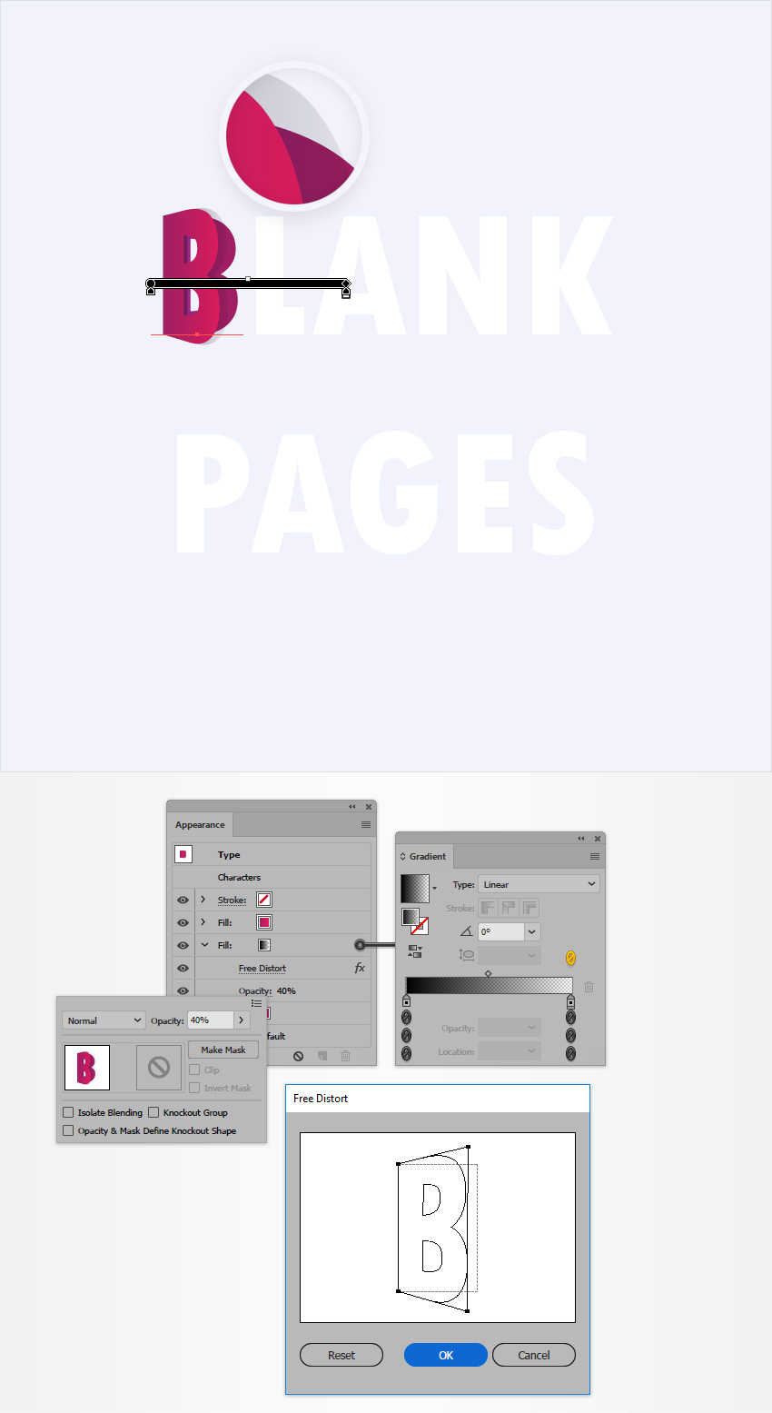 Перетащите эту новую заливку между двух предыдущих и примените к ней линейный градиент как показано ниже. Затем снизьте Opacity/Непрозрачность до 40% и выберите Effect > Distort & Transform > Free Transform/Эффект>Искажение и трансформация>Свободное трансформирование. Вновь перетяните правые точки как показано ниже и нажмите OK.