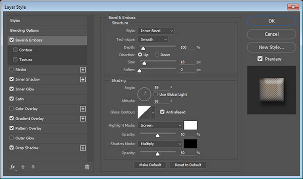 1. Добавьте Bevel and Emboss / Тиснение и задайте следующие параметры: