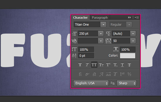 Создайте текст (используйте заглавные буквы) шрифтом “Titan One”. Цвет текста = #d8d8d8, размер (Size) = 250 pt, и параметр Tracking (расстояние между буквами) = 50.
