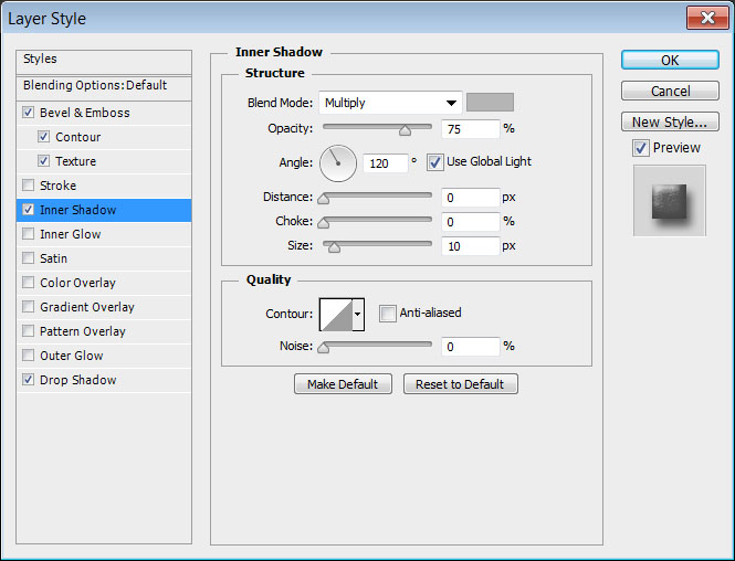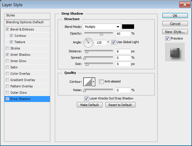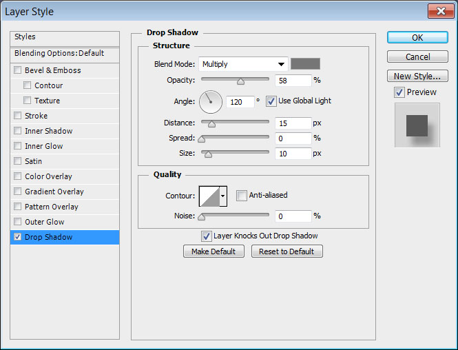 Кликните дважды по слою “Shadow”, чтобы примените к нему стиль слоя Drop Shadow / Тень со следующими параметрами: