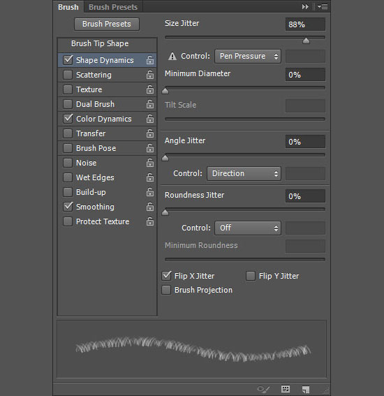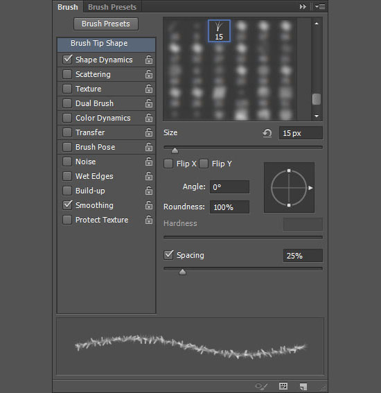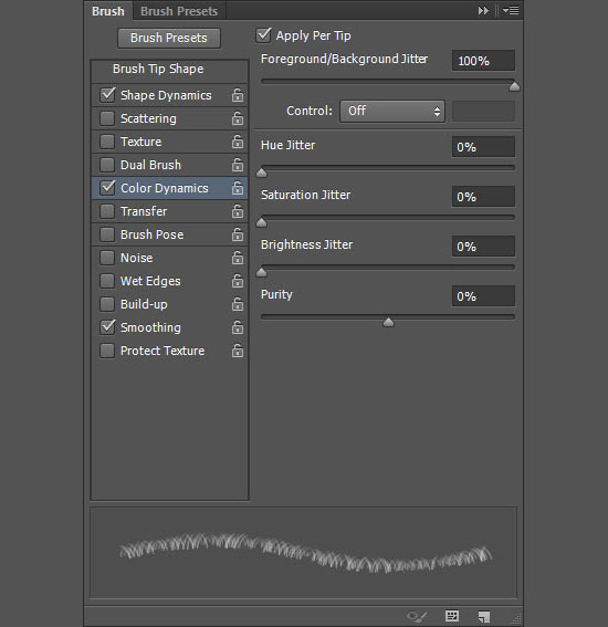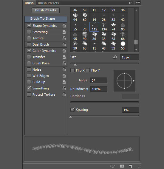 Возьмите инструмент Brush / Кисть, откройте палитру Brush / Кисти (Window > Brush / Окно > Кисти). Выберите кисть “Dune Grass”, и укажите ей параметры как на картинке ниже: