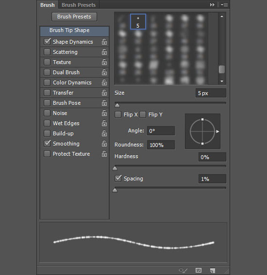 Выберите инструмент Eraser / Ластик, откройте палитру Brush / Кисть и выберите растушеванную кисть размером в 5 px. Затем укажите параметры как на картинках ниже: