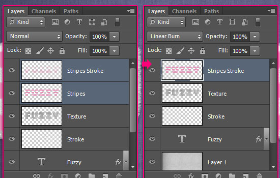 Выделите слои “Stripes” и “Stripes Stroke”, выберите в меню Layer > Merge Layers / Слои > Объединить слои, затем вновь смените режим наложения получившегося слоя на Linear Burn / Линейный Затемнитель.